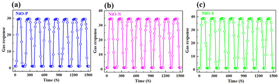 Stability is crucial for the preparation of sensitive materials into devices, which is related to the lifetime and performance stability of the devices. Figure 12 shows the reversibility of (a) NiO-P, (b) NiO-N, and (c) NiO-S. We tested eight response–recovery cycles for each sample. It could be seen that the NiO hollow spheres had good stability and reproducibility, and the gas response values for eight cycles were almost unchanged. At the same time, after the removal of ethanol gas, the gas response could still return to the baseline position. Compared to other one-dimensional and two-dimensional structures, this stability might be attributed to the spherical structure, which was relatively stable and not easily collapsed. This structural stability ultimately led to the stabilization of the sensitive properties. The different surfaces of the spherical structures caused their gas responses to be different.