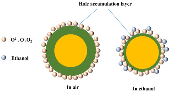 When the p-type NiO was placed in the air, the surrounding O2 adsorbed on the semiconductor surface and reacted with it. After electron transfer, O2 became negatively charged oxygen species (O2−, O−, O2−), and a hole accumulation layer (HAL) was formed. When NiO was placed in ethanol gas, the ethanol molecules exchanged electrons with oxygen species, releasing electrons captured from the inside of the material. At this time, the HAL of NiO became thinner, and the migration of electrons caused the resistance to change. Figure 13 shows the schematic diagram of the gas sensing mechanism.