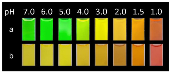 pH-induced color changes of QC1 (0.5 mM) aqueous solution (a) under irradiation by LED (λex = 365 nm) and (b) in daylight.