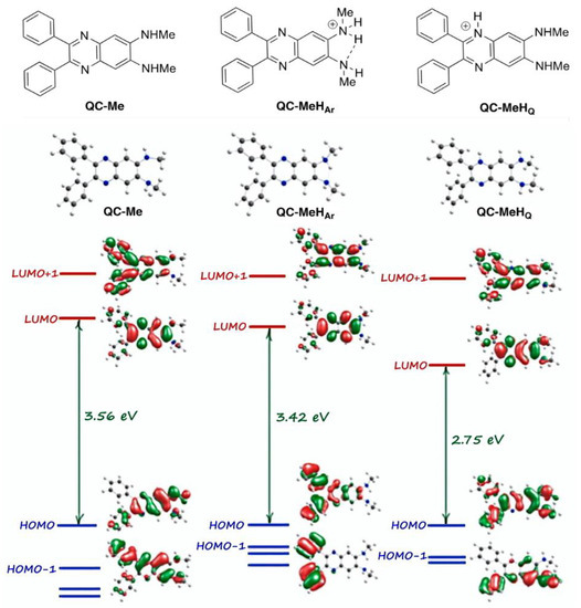 Therefore, we resorted to DFT computations in an attempt to gain a more definite source of reasoning. To be clear, we did not attempt to achieve a qualitative estimate of basicity constants, as such computations are still quite unreliable but very time-consuming. Instead, we chose to rely on the much simpler computation of the electronic structure of both possible protonated species in the hope that the comparison would reveal a substantial and unambiguous difference that could be related to experimental findings. The model compounds, 2,3-dipehenyl-6,7-bis(N-methylamino)quinoxaline (QC-Me) and two monoprotonated species QC-MeHAr and QC-MeHQ, were computed at the DFT B3LYP//STO 6-31G(d,p) level of theory (Figure 4). We argued that the methoxycarbonyl substituent of QC-1 can be omitted, and the 3-aminopropyl chain can be safely truncated to methyl, as it can be expected to not cause a substantial disturbance in the electronic structure of the model molecules. The geometry of the model compounds was fully optimized, and the assignment to the true minima was ascertained by computing vibrational modes, all of which were positive. The most essential results are presented in Figure 4, where the frontier orbitals are shown at the same scale and formally aligned at the respective HOMO levels.