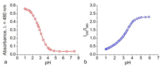 Changes in (a) absorption intensity (480 nm) and (b) emission intensity based on ratiometric measurements (the pair I530 and I580 was used) in the pH range of 1–7.