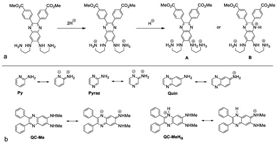 (a) Protonation sequence for quinoxaline QC1. (b) Structures of amino-substituted aromatic heterocycles Py, Pyraz, Quin, QC-Me and QC-MeHQ. Triprotonated tautomers of QC1 are labeled as A and B.