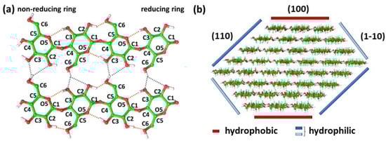 The knowledge of the molecular structure of cellulose is of prime importance to explain its characteristic physicochemical properties, such as hydrophilicity, chirality, biodegradability and high functionality. Indeed, the presence of three equatorial hydroxyl groups in each AGU—the two secondary alcohols in position C2 and C3, and the primary alcohol, the hydroxymethyl group, in position C5—donate chirality and hydrophilic properties to cellulose. Additionally, the numerous axial C-H present in the sugar rings give a hydrophobic character to the polymer [20,24]. In addition, the chemical difference of the two ends of the molecule—the non-reducing (C4-OH group) and reducing (C1-OH group) ends—provides the polarity character to the cellulose chain, which also confers interesting properties to the crystalline architecture and chain alignments (i.e., polar or antipolar) [25]. For these reasons, cellulose exhibits an amphiphilic nature and an intrinsic structural anisotropy (Figure 1a,b) [20,24].