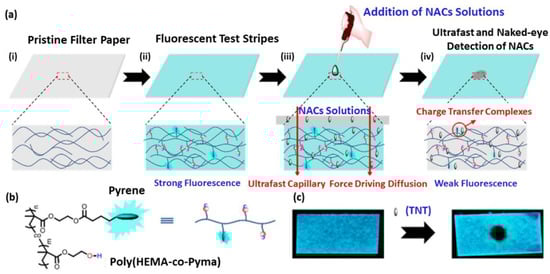Electrospinning was also employed for the preparation of a microporous nanofiber film from 1,4-dihydroxyanthraquinone (1,4-DHAQ) and cellulose acetate [139]. The fluorescence intensity of the resulting film decreased linearly with the concentration of Cu2+ with high selectivity, indicating the potential applications of this fluorescent sensor in environmental monitoring. Paper-based fluorescent test strips for the detection of toxic nitroaromatic compound pollutants, such as 2,4,6-trinitrotoluene (TNT), were prepared by absorbing hydrophilic pyrene-functionalized polymer into cellulose-based filter papers (Figure 7a,b). Upon exposure of the contaminated sample to the test strips, the paper substrate allows for an ultrafast and spontaneous capillary force driving diffusion of TNT into the hydrophilic matrix, resulting in an efficient quenching of pyrene. This paper-based test strip enables both the fluorescent and naked-eye (Figure 7c) detection of TNT even at a low-ppm level [140].