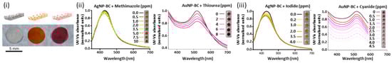 (i) Schematic representation (top) and photographical images of BC, AgNP–BC and AuNP–BC plasmonic nano-paper composites (from left to right). (ii) Change in UV-vis spectra and color of AgNP–BC paper composite upon addition of methimazole and of AuNP–BC upon addition of thiourea. (iii) Change in in UV-vis spectra and color of AgNP–BC upon addition of iodide and of AuNP-BC upon addition of cyanide [121]. Copyrights: all the images have been adapted and reproduced with permission from © 2015, American Chemical Society.