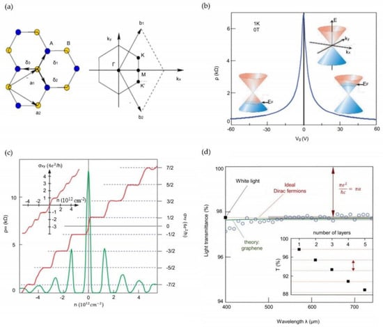 Electronic and optical properties of graphene. (a) Hexagonal lattice structure (left) and its Brillouin zone (right). (b) Ambipolar electric effect of single-layer graphene. (c) Response of graphene in terms of hall conductivity (red) and longitudinal resistivity (green) with respect to the carrier concentration. (d) Transmittance spectrum of single-layered graphene. Reproduced from Sang, M., Shin, J., Kim, K., and Yu, K.J., 2019. Electronic and thermal properties of graphene and recent advances in graphene-based electronics applications. Nanomaterials, 9(3), p. 374 [68].