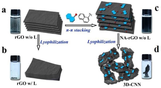 Schematic diagram of the fabrication process of 3D-crumpled NA-rGO nanosheets for NO2 gas detection. (a,b) The formation of aggreated 2D plane rGO nanosheets with the lyophilization process. (c) Dispersion of 2D plane NA-rGO nanosheets with the lyophilization process. (d) The lamination and separation of 3D crumpled NA-rGO nanosheets with the lyophilization process [101]. Reproduced from Chen, Z., Wang, J., Umar, A., Wang, Y., Li, H. and Zhou, G., 2017. Three-dimensional crumpled graphene-based nanosheets with ultrahigh NO2 gas sensibility. ACS applied materials & interfaces, 9(13), pp. 11819–11827.