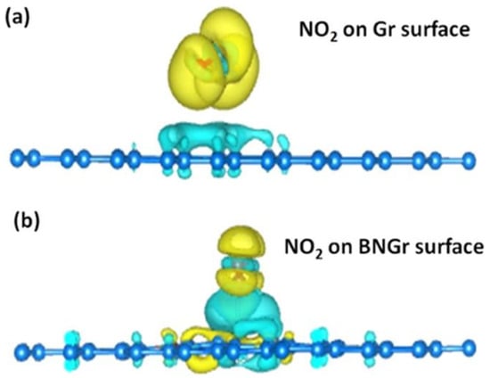 Charge densities of the (a) graphene and (b) BN-graphene surface with NO2 molecules [102]. Reproduced from Srivastava, S., Pal, P., Sharma, D.K., Kumar, S., Senguttuvan, T.D. and Gupta, B.K., 2022. Ultrasensitive Boron–Nitrogen-Codoped CVD Graphene-Derived NO2 Gas Sensor. ACS Materials Au, 2(3), pp. 356–366.