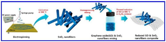 Choi et al. [106] said that electrospinning and high-temperature calcination were used to create 1D nonwoven tin oxide nanofibrous (SnO2 NF) mats with a high surface-to-volume ratio. Then, the SnO2 NFs and Graphene oxide nanosheets (GO NSs) were combined, and in the final stage, the GO NSs were reduced to rGO NSs by annealing in the gas-forming process. Figure 4 [106] represents the fabrication process of these sensors.