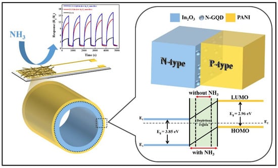 - Hong, S.-Z.; Huang, Q.-Y.; Wu, T.-M. The room temperature highly sensitive ammonia gas sensor based on polyaniline and nitrogen-doped graphene quantum dot-coated hollow indium oxide nanofiber composite. Polymers 2021, 13, 3676. [Google Scholar] [CrossRef]