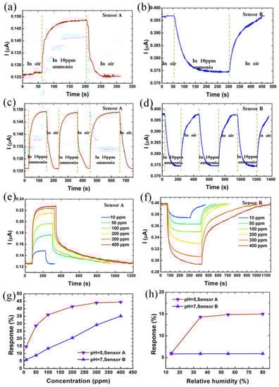 The current responses were −14.9% and 5.9% when the sensors were exposed to NH3 gas (Figure 6a,b). It was indicated that the sensors have different electrical responses with the same concentration of the gas molecules. The sensors are highly stable (Figure 6c,d), and the response and recovery can be varied (Figure 6e,f) to different NH3 concentrations. Additionally, the absolute response of the sensors at various concentrations is shown in Figure 6g, while the ones made with aqueous GQDs with pH 7 and pH 5, respectively, are shown in Figure 6h.