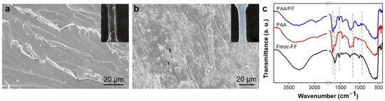 SEM images of (a) PAA gel, (b) PAA/FF gel; (c) the FTIR spectra of Fmoc-FF, PAA, and PAA/FF gels.