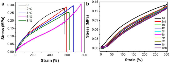 (a) The tensile stress-strain curves of the PAA/FF/KCl gels with different KCl (wt%). (b) The cyclic tensile stress-strain curves of the PAA/FF/KCl gel with 6 wt% KCl.