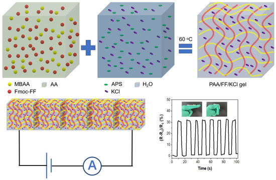 As an important soft matter, hydrogels contain three-dimensional porous network structures and a large amount of water trapped inside [19]. Hydrogels based on peptides with fibrillar networks have attracted significant attention as they possess excellent and unique biomimetic and biocompatible properties [20]. However, peptide hydrogels are prepared through non-covalent interactions, leading to a poor gelation stability and weak mechanical strength. Therefore, significant efforts have been made to produce highly durable peptide hydrogels for domestic and industrial applications, including tough double-network hydrogels (DN gels) [21,22,23]. DN gels consist of two interpenetrating networks: a relatively brittle first network with a low concentration and a sparsely cross-linked ductile second network with a high concentration [24,25,26]. Polymer gels are quite superior and chosen as a member of DN gels due to their excellent mechanical properties via their covalent chains [27,28]. Therefore, peptide and polymer DN gels with a good flexibility, stretchability and resilience are potential candidates for strain sensors.