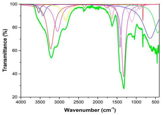 Bare N-CQDs experimental infrared spectrum (green bold line) and its deconvolution (thin lines, various colors). A total of 16 Lorentzian functions was used to fit the total pattern.