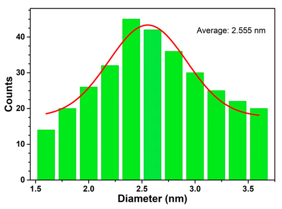 The synthesized N-CQD nanoparticles were analyzed with SEM microscopy to evaluate their morphology. The study, whose typical image is reported in Figure 2, revealed that the drop-cast sample is composed of very small spherical particles, having diameters falling in the range of 1.6–3.6 nanometers. The size distribution of the particles, in terms of individual diameters, is reported in Figure 3. The distribution has a pseudo-Gaussian shape, with a mean value = 2.555 nm, standard deviation = 0.366 nm, and FWHM = 0.862 nm, and confirms that low-nanometric particles can be obtained with the reported methodology.