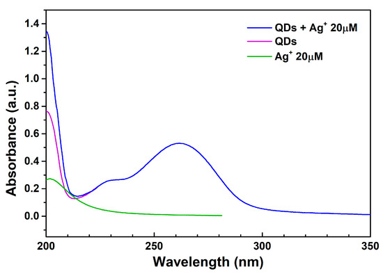 UV–Vis absorption spectra of bare N-CQDs solution (middle, violet), N-CQDs solution containing [Ag+] = 20 m (top, blue) and of a [Ag+] = 20 m water solution.