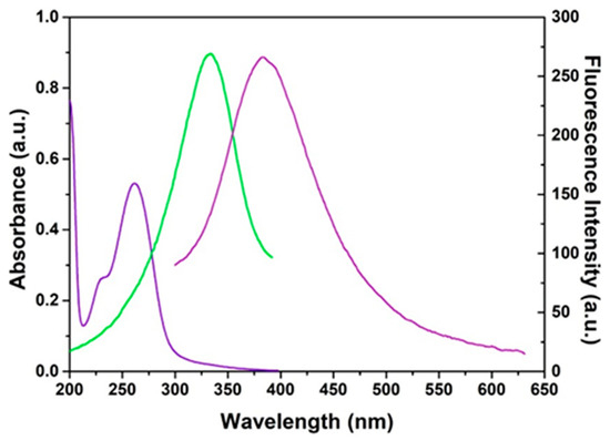 UV–Vis absorption spectra of N-CQDs stock solution (left, violet), excitation spectrum (green), and fluorescence (right, violet).