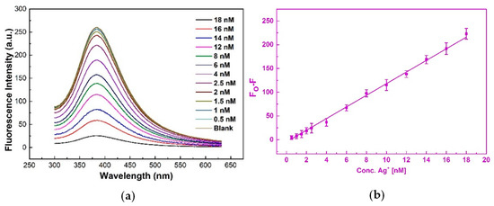 (a) Ag+ + N-CQDs solution fluorescence intensity at different metal concentrations. (b) Plot of fluorescence intensity difference between the reference solution (blank) and the N-CQDs Ag+ solutions at different concentrations.
