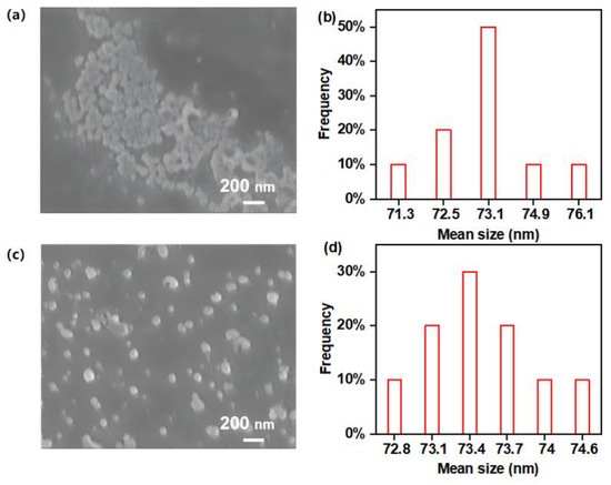 SEM images of l-PAnTPE (a) and PAnTPE (c), and particle size distributions of l-PAnTPE (b) and PAnTPE (d).