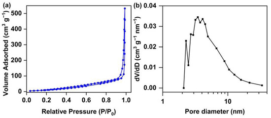 The nitrogen isothermal adsorption desorption curves (a) and pore size distribution (b) of PAnTPE.