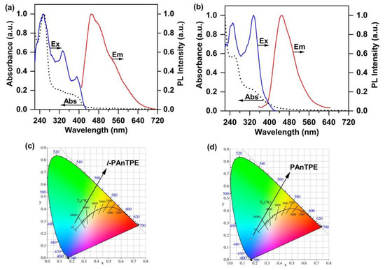 The excitation spectra, UV–Vis absorption spectra and emission spectra of l-PAnTPE (a) and PAnTPE (b) in water. CIE of l-PAnTPE (c) and PAnTPE (d) in water.
