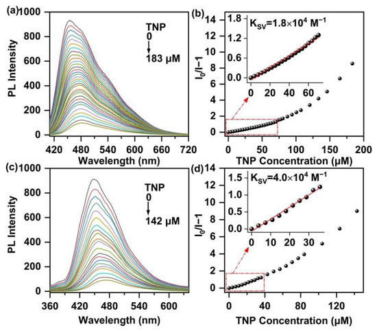Emission spectra of l-PAnTPE (a) and PAnTPE (c) aqueous dispersion with increasing amounts of TNP. S–V plots of PL intensity (I0/I−1) of l-PAnTPE (b) and PAnTPE (d) vs. TNP concentration.