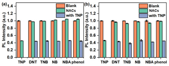 The quenching degree of l-PAnTPE (a) and PAnTPE (b) aqueous dispersion towards different nitroaromatics (NACs) and phenol of 70 μM and 35 μM, respectively, followed by adding the same amount of TNP.