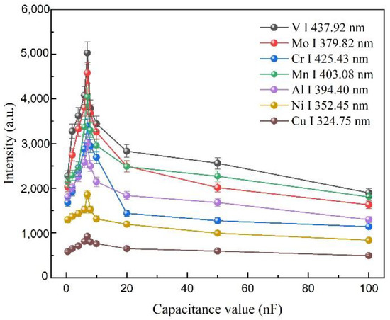 The discharge capacitance is a very important parameter for a spark discharge unit due to the time constant of the discharge and the storage of electrical energy depending on the capacitance. Figure 4 shows the plots of signal intensities of seven atom lines, including V I 427.92 nm, Mo I 379.82 nm, Cr I 425.43 nm, Mn I 403.08 nm, Al I 394.40 nm, Ni I 352.45 nm, and Cu I 324.75 nm, versus the different values of capacitance, where the femtosecond laser single-pulse energy, the discharge voltage, the integration time of the CCD, and the average number of repetitions for each measurement were 0.4 W, 2.4 kV, 2, and 500, respectively. The net signal was observed to be maximal at 7 nF. This result could be explained by the relationship between the dynamic energy storage and the discharge time constant of the capacitance. For a small capacitance, almost all the electrical energy could be stored in the capacitance, and the electrical energy would be deposited into the laser-induced plasma, enhancing the intensities of the analytical lines. Additionally, a small capacitance shortened the discharge time constant over which the spark discharge unit occurred. Hence, a 7 nF capacitance was selected in the following experiments.