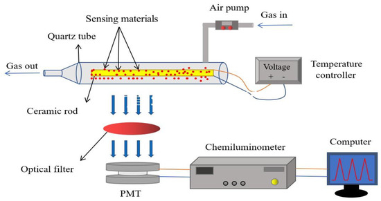 The system diagram of the ultra-weak chemiluminescent instrument (BPCL-1, Guangzhou Micro Light Technology Co., Ltd., Guangzhou, China) is shown in Figure 1. The system is divided into three parts: (I) reaction chamber: the chamber is composed of a ceramic heating rod coated with CdS/SnS nanocomposites and a quartz tube with a gas inlet and outlet, and the gas to be measured enters the quartz tube from the air inlet and reacts when in contact with the material; (II) temperature and flow rate control device: the temperature control system increases the surface temperature of the heating rod, and the air pump controls the carrier air velocity; (III) photoelectric detection and data processing system: the system consists of the BPCL-1 ultra-weak luminescence analyzer and the computer used to catalyze the luminescent signal. The concentration of the detection gas is calculated by the following formula [31]: