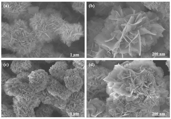 The SEM images of SnS nanoflowers are shown in Figure 2a,b. SnS has a microstructure similar to a nanoflower, a regular morphology and a uniform distribution, and a large number of nanoparticles are stacked into nanospheres. Figure 2b shows its enlarged image, and the flower-like leaves are composed of ultra-thin nanosheet structures with clear and smooth surfaces. This composite has a large particle size. The size is large, and the synapses of the flower-like leaf structure on the surface are obvious, which can increase the contact area between the material and the gas, which is conducive to the adsorption and diffusion of gas. Figure 2c,d show images of CdS/SnS. Compared with the SEM of SnS, it is found that there are more agglomerated particles on the surfaces of the SnS nanoflowers. The particle size of the composite becomes smaller, the structure becomes denser, and the number of external nanosheets increases. In addition, the coated structure of the new composite helps to increase the specific surface area of the material that contacts the gas, provides more active sites for the adsorption and diffusion of the gas in the reaction, and also helps to improve the response and recovery times of the sensor.