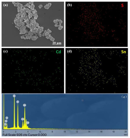 (a) SEM image; EDS mapping images of (b) S, (c) Cd and (d) Sn; and (e) EDS spectrum of CdS/SnS.