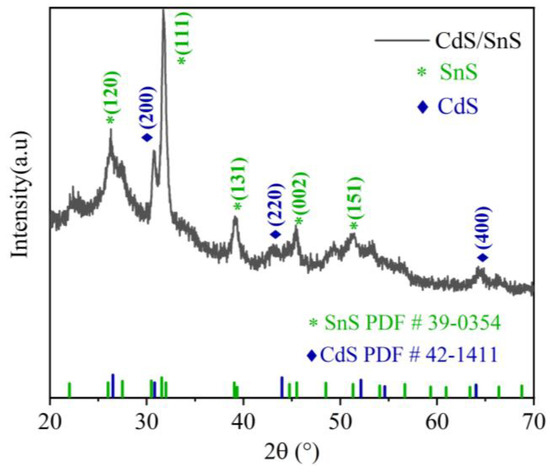 The X-ray diffraction (XRD) pattern for CdS/SnS is shown in Figure 4. According to the standard cards (PDF# 39-0354 and PDF# 42-1411), all diffraction peaks can be attributed to SnS and CdS, indicating the successful synthesis of CdS/SnS composites. The diffraction peaks at 2θ = 26.0°, 31.5°, 39.0°, 45.5° and 51.3° are attributed to the (120), (111), (131), (002) and (151) crystal faces of SnS, respectively, and the diffraction peaks at 2θ = 30.8°, 43.9° and 64.0° are attributed to the (200), (220) and (400) crystal faces of CdS, respectively. No diffraction peaks of other impurities were observed, which further indicates that CdS/SnS has a high purity.