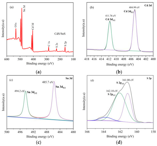 The elemental composition and electronic states of CdS/SnS nanocomposites were analyzed by XPS. As shown in Figure 5, the complete spectrum of XPS clearly shows the presence of Sn, Cd and S in the composite, indicating significant changes in the electronic states of these three elements, as well as minor peaks due to O and C changes due to adsorption on the surface of the material. Figure 5b–d show the high-resolution XPS spectra of Cd 3d, Sn 3d and S 2p of CdS/SnS nanocomposite structures, respectively. The characteristic peaks of the Cd 3d spectrum are observed at 404.99 eV and 411.76 eV, corresponding to Cd 3d5/2 and Cd 3d3/2, respectively. The two peaks at 485.7 eV and 494.2 eV are attributed to Sn 3d5/2 and Sn 3d3/2, respectively, and the two characteristic peaks shown in the Cd 3d and Sn 3d spectra are located at two different orbitals, 5/2 and 3/2, respectively; the proportions are different, indicating that they are associated with the Cd2+ and Sn2+ states in CdS and SnS [32,33]. According to the periodic law of Cd and Sn, both of them have highly volatile electrons that form the divalent states Cd2+ and Sn2+. However, because the cationic oxidation of Sn is stronger than that of Cd, SnS is mainly used as a catalyst in the whole CTL process, and the incorporation of Cd metal elements promotes the absorption of O2 on the surface of the material, which greatly improves the CTL performance of the composite material; the spectral characteristic peaks of the two elements are similar, and the peak crack at 8.5 eV can also confirm the formation of SnS [34]. Figure 5d shows the high-resolution spectrum of S 2p, which is divided into three asymmetric peaks; the peaks at 161.08 eV and 162.18 eV are S 2p3/2 and S 2p1/2, respectively, with an energy interval of 1 eV and a peak-intensity ratio of 1.2:1, indicating a change in the valence state of S.
