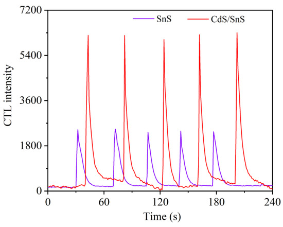 The CTL performance is shown in Figure 6. Both sensitive materials have the highest peaks of luminous intensity within 3 seconds of CS2 introduction, indicating that the two materials have a fast response to CS2. The signal intensity of CTL on CS2 when CdS/SnS was used as a sensitive material was significantly higher than that when using SnS as a material. The composite exhibits a strong CTL reaction to CS2. It is shown that compared with pure SnS materials, CdS/SnS nanocomposites exhibit excellent CTL properties. The introduction of cadmium ions increases the cation content on the surface of the material, and the oxygen vacancy gradually increases in order to balance the charge to offset the electrical deviation of the material due to the increase in cadmium ion content. Studies have shown that the higher the content of oxygen molecules adsorbed on the surface of the material, the more oxygen vacancies on the surface of the material [35]. The addition of CdS can effectively enhance the signal intensity of the CTL method of pure SnS materials to detect CS2, and subsequent research on the sensitive characteristics of CS2 was carried out with CdS/SnS nanocomposites as sensitive materials.
