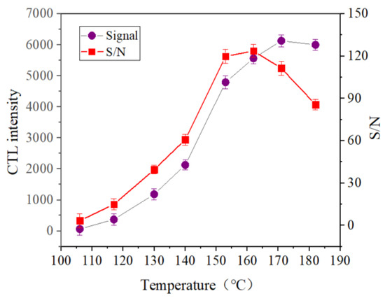 Effect of working temperature on CTL intensity and S/N (concentration: 33.75 ppm; flow rate: 280 mL/min).