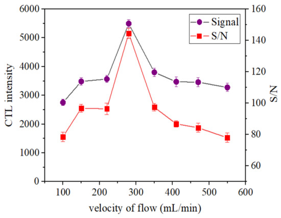 Effect of flow rate on CTL intensity and S/N (concentration: 33.75 ppm; temperature: 162 °C).