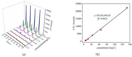 Under optimal conditions, the correspondence between the signal strength and the CS2 concentration of the CTL sensor based on CdS/SnS composites in the CS2 concentration range of 6.75~168.75 ppm was studied. Different concentrations of the compound vapor react with nanocomposites so that the sensor obtains different responses, because the equilibrium process of the CTL reaction is different at different concentrations. There is a dynamic equilibrium between the adsorption and desorption of gases on the surface of the sensing material. When the concentration of the compound vapor is low, the equilibrium process of the reaction takes a long time. Therefore, this stage of adsorption plays a leading role in the entire gas detection process. Conversely, when the concentration reaches a higher level, the reaction quickly reaches equilibrium, and then gas desorption dominates the sensor’s detection process [38]. Figure 9a shows the CTL signal produced by different concentrations of CS2. The intensity of the CTL signal increases significantly as the concentration increases. Figure 9b shows the correspondence between the CTL intensity and the concentration of CS2. It can be seen that the CTL intensity and the concentration of CS2 show a good linear relationship; the linear regression equation is y = 187.95x − 903.65 (R2 = 0.9974), where y is the average CTL intensity with CS2 on the surface of the two-dimensional nanocomposite after four parallel experiments, x is the CS2 concentration, and R is the correlation coefficient. The LOD is calculated according to the following formula, and the value is 0.96 ppm (S/N = 3).