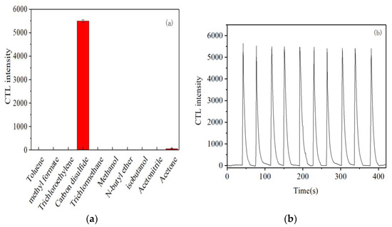 (a) CTL response of the sensor to different compounds; (b) results obtained from ten repetitions of CS2 determination (flow rate: 280 mL/min; temperature: 162 °C; concentration: 33.75 ppm).