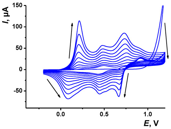 The electropolymerization is initiated by the formation of the cation radical at high anodic potential. In consecutive potential cycling, the height of appropriate anodic peak is decreased thanks to the partial shielding of the electrode surface. Three other peak pairs correspond to the redox reactions of the polyaniline forms (leuco-emeraldine, emeraldine salt, and pernigraniline) and of the quinoid byproducts of oxidation [33,34]. They increase within the number of potential cycles, indicating the accumulation of the redox active materials on the electrode. The conditions of the electropolymerization have been specified in our earlier studies concerning the development of potentiometric sensors on the basis of other macrocyclic ionophores [23,35,36]. The use of 10 cycles is a compromise between the requirements of obtaining full coverage of the electrode and the formation of rather thin film with the low barrier of the transfer of counter ions and redox active species. The choice was also confirmed by the metrological assessment of the equilibrium potential, which showed the lowest deviation (1.1% for six measurements with individual sensors in the range of the cycle variation from 5 to 30). The implementation of P[6]A either on the electrode or in the reaction media did not alter the morphology of the voltammograms but did increase the currents of the pernigraniline-emeraldine salt pair. This is explained by the similarity of the potentials of the oxidation of hydroquinone units of the P[6]A molecules and the polyaniline formed. Owing to the similarity of the redox behavior and possible interferences with Cu2+/Ag+ binding, other experiments were performed with the P[6]A added to the synthesized polyaniline film.