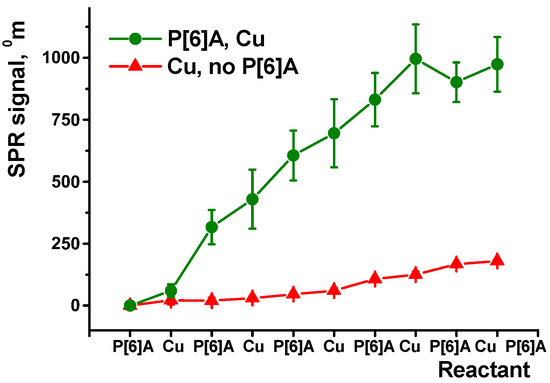 Changes in the SPR signal recorded after pumping the P[6]A/Cu2+ solutions were observed within 200–240 s. After that, a steady-state signal was reached, indicating equilibrium in the transfer of the reactant on the electrode interface. The use of the only reactant, i.e., P[6]A with no CuCl2 or vice versa, resulted in rather low adsorption on the underlying surface (Figure 3).