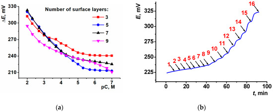 (a) Calibration curves of Cu2+ ions obtained with different numbers of layers deposited on the polyaniline film: P[6]A—CuCl2—P[6]A (three layers); (P[6]A—CuCl2)2—P[6]A (five layers); (P[6]A—CuCl2)3—P[6]A (7 layers); (P[6]A—CuCl2)4—P[6]A (nine layers); (b) dynamic response of the potentiometric sensor with seven layers on the addition of 0.1 μM–10 mM CuCl2 solution (concentrations corresponded to red numbers are presented with appropriate numbers in Table S1). Measurements in the presence of 0.1 M NaCl.
