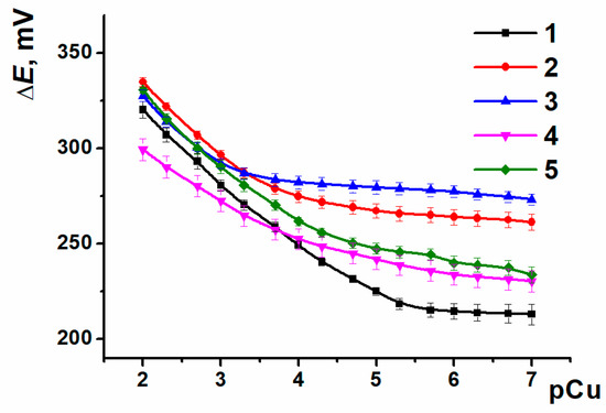 Calibration curves of Cu2+ ions obtained with potentiometric sensor with five layers (1) and an additional upper layer: 2 mg/mL PSS (2), 1% Nafion (3), 3% glutaraldehyde (4), and 4.0 mM CuCl2 (5).