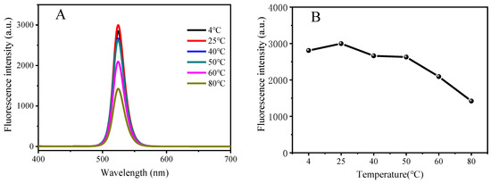 The reaction time and the temperature of the medium are important factors that affect the fluorescence intensity. Temperature and standing time stability were investigated in this experiment, and the results are shown in Figure 4. It can be seen that with the gradual increase in temperature, the fluorescence intensity of CsPbBr3/Cs4PbBr6 PNCs gradually decreases, indicating that the fluorescence intensity of PNCs is closely related to temperature and will weaken its fluorescence intensity at high temperatures. This is because the Ostwald ripening occurred during the crystal growth process with the increase in temperature, resulting in a larger crystal size [46]. Therefore, we stored the prepared CsPbBr3/Cs4PbBr6 PNCs in a low-temperature environment. At the same time, the fluorescence intensity of the PNCs did not change much within 21.5 h of placement. As long as it was used within this time range, the fluorescence intensity of the PNCs remained stable.