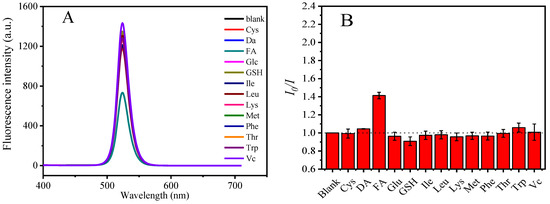 Various common small biomolecules, including cysteine (Cys), dopamine (DA), folic acid (FA), glucose (Glu), glutathione (GSH), isoleucine (Ile), leucine (Leu), lysine (Lys), methionine (Met), phenylalanine (Phe), threonine (Thr), tryptophan (Trp), and ascorbic acid (Vc) were added to the PNCs for studying the selectivity of the fluorescence probe. The results shown in Figure 5A,B indicated that FA can significantly quench the fluorescence of the PNCs, while other small biomolecules have little effect on the fluorescence of the PNCs. We also investigated the interference in terms of the detection of FA in the presence of other small biomolecules. As shown in Figure 5C, the detection of FA using the PNCs was not disturbed in the presence of 2000 μM of other biomolecules.