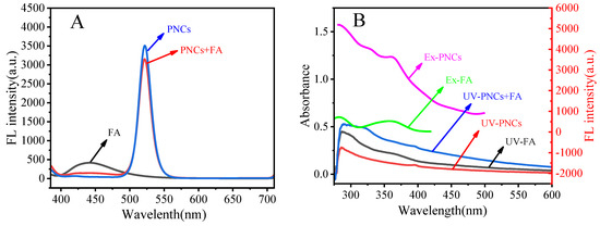 The mechanism for the fluorescence quenching of the PNCs by FA is discussed. As shown in Figure 8A,B, the high concentration of FA has a weak fluorescence and the mixing of FA and PNCs would quench their fluorescence. The UV absorption spectrum of FA overlaps with the excitation spectrum of the PNCs, so the inner filter effect may be one of the possible factors leading to the fluorescence quenching of the PNCs. However, later study found more evidence for the quenching of fluorescence. As shown in Figure 8C, the zeta potential analysis showed that FA and the PNCs have opposite charges (−23.4 and 79.0 mV, respectively) and the mixing of FA and the PNCs would reduce the distance between each other. The fluorescence decay of the PNCs decreased significantly in the presence of FA (Figure 8D), and the changes in fluorescence lifetime (shown in Table 2) indicated that the quenching process is that of dynamic quenching, which may be caused by the collision between the two via electrostatic interaction. The inner filter effect of PNCs and FA is not the only cause for the quenching of fluorescence because the fluorescence lifetime does not change in terms of the inner filter effect [53]. To further study the electrostatic interaction of FA and the PNCs, similar molecules (including methotrexate, pemetrexed, aspartic acid, and histidine) containing polar groups (such as OH, −COOH, and −NH2) were used to interact with the PNCs. The zeta potential test results showed that methotrexate, pemetrexed, and histidine have negative charges on their surfaces and can interact with the PNCs electrostatically. However, the fluorescence of the PNCs did not change after interaction with these molecules (Supplementary Materials, Figure S7). Thus, electrostatic interaction is not a key factor for fluorescence quenching. Another possible reason is that the amino group on the surface of the PNCs interacts with the carboxyl group on the surface of folic acid to form a complex. The energy in the conduction band of the PNCs is transferred to the LUMO orbital of the complex, eventually leading to fluorescence quenching [54]. However, other similar molecules do not affect the fluorescence of the PNCs because the LUMO orbital energy is higher than the energy of the perovskite conduction band after the formation of the complex.