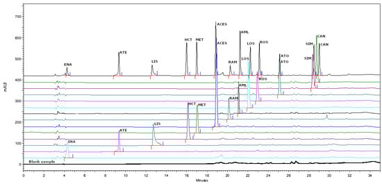 Recently, multianalyte analysis is a primary goal of analytical laboratories, which creates new challenges in terms of rapid analytical response as well as problems with matrix effect and interferences between analytes [18]. Such a large number of active substances and the possibility of their occurrence in various quantitative and qualitative configurations in polypill preparations [34] prompted the authors to develop and validate a chromatographic method that would allow the simultaneous determination of the active substances found in polypills regardless of their quantitative and qualitative relationship. In this paper, a new HPLC-DAD method was developed for the separation and simultaneous determination of thirteen compounds (ACE inhibitors: ramipril, lisinopril, enalapril; β-blockers: atenolol, metoprolol; sartans: losartan, candesartan; statins: rosuvastatin, atorvastatin, simvastatin; calcium channel blocker: amlodipine; diuretic: hydrochlorothiazide, anticoagulant: acetylsalicylic acid), which can occur in polypills used in the treatment of CVDs. The usefulness of this work was assessed by validation and measurements in prepared mixtures according to available pharmaceutical formulations.