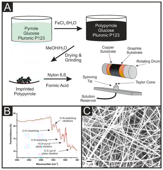 (A) Illustration of the production of electrospun MIP sensors. (B) FT−IR analysis of the polypyrrole MIP. (C) Image of electrospun nylon fibers embedded with PPy MIPs for the detection of glucose. Figure reproduced with permission from ref. [77]. Copyright 2021, American Chemical Society.