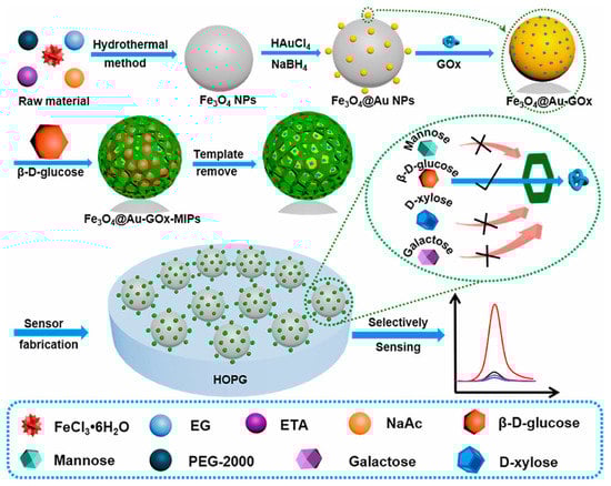 Preparation of the Fe3O4@Au-GOx-MIPS sensor and representation of the sensing mechanism achieved with CV analysis. Figure reproduced with permission from ref. [120]. Copyright 2022, Elsevier.