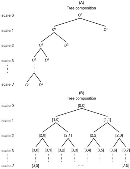 For further enhancing the resolution in frequency, wavelet packet transform (WPT) was developed. MRSD algorithm can also be employed for the calculation. In the calculation, however, as shown in Figure 1B, two branches of the decomposition are performed, i.e., both the discrete approximation and detail are further decomposed into two parts in the calculation of each scale. Therefore, the signal can be decomposed into 2J components for a J scale decomposition, and the frequency of the components is in order from low to high frequency.